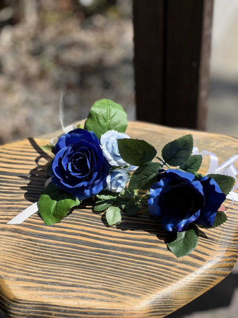 ブルー系の花にパープルを添えて人気の花色で仕上げました。お好みの色合いがある場合はあらかじめのご予約をお願いします。…